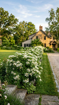 A sweeping climbing hydrangea covering a stone garden wall creates show-stopping farmhouse curb appeal.