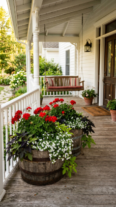 Half wine barrels overflowing with seasonal flowers on a farmhouse porch are charming, simple, and endlessly versatile.