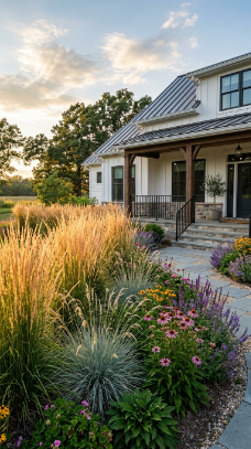 Tall ornamental grasses used as a border planting add graceful, swaying movement to a farmhouse landscape.
