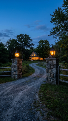 Handsome stone entry pillars topped with black iron lanterns make a grand and beautiful farmhouse entrance statement.