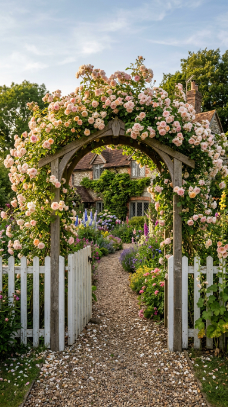 A timber garden arch smothered in climbing roses at the garden entrance is farmhouse curb appeal at its most romantic.