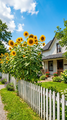 A tall, joyful row of sunflowers planted along the front fence line is the happiest farmhouse curb appeal gesture.