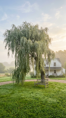 A graceful weeping willow planted as a front yard focal point tree gives a farmhouse landscape something truly magical.