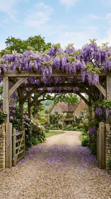 A wisteria-draped pergola framing the driveway entrance is a show-stopping farmhouse landscape moment.