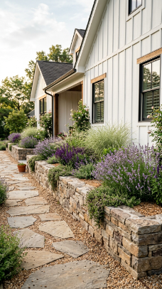 Low raised stone planting beds built against the home’s foundation give a farmhouse a beautifully grounded, established look.