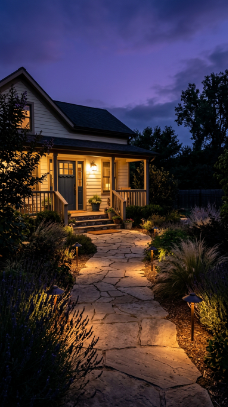 Soft warm landscape lighting along the front pathway at dusk transforms any farmhouse exterior into pure magic.