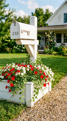 A painted wooden mailbox post with a built-in planter box overflowing with flowers is a charming small farmhouse detail.