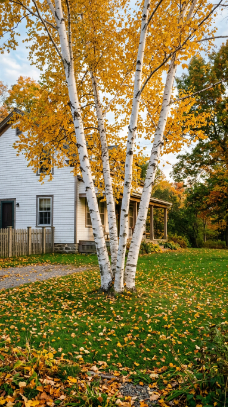 A small planted grove of white birch trees along the side yard creates ethereal, four-season farmhouse beauty.