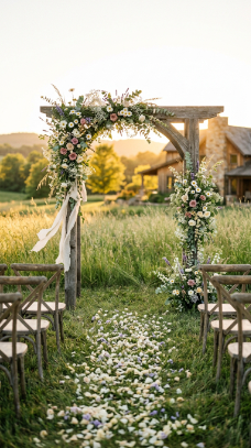 A rustic wooden arch wrapped in loose wildflowers creates the dreamiest ceremony backdrop.