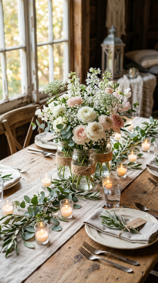 Simple mason jars tied with twine and filled with wildflowers bring effortless charm to every table.