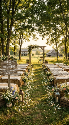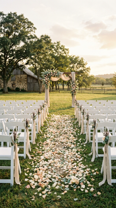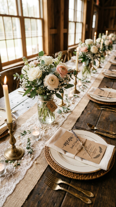 Think shiplap backdrops, mason jar centerpieces, and linen tablecloths that flutter in the summer breeze. It’s the kind of wedding that feels like coming home — cozy, beautiful, and completely you.