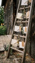 A weathered wooden ladder leans beautifully as a card and envelope display station.