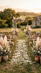 Tall pampas grass stems lining the aisle create a boho-farmhouse moment that’s pure magic.