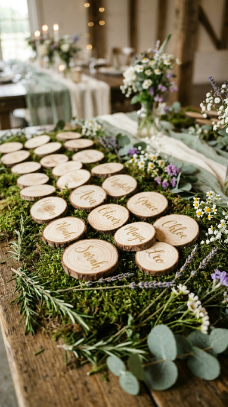 Tree slice escort cards with calligraphy look stunning and double as keepsakes for guests.