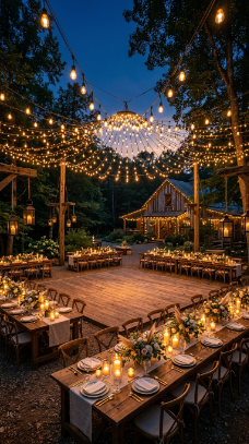 A ceiling of warm string lights transforms any barn or outdoor space into pure enchantment.