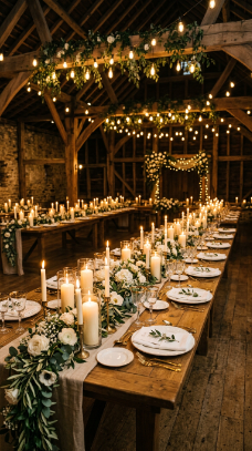Long farm tables glowing with clusters of pillar candles feel impossibly romantic in a barn.