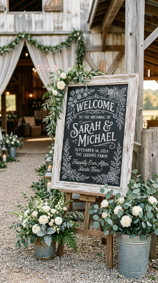 A hand-lettered chalkboard sign nestled in a wooden frame welcomes guests with rustic elegance.