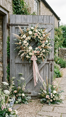 A massive floral wreath hung on a weathered barn door creates a stunning statement moment.