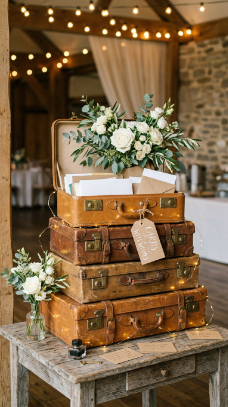 Stacked vintage suitcases create a whimsical and totally charming card collection station.