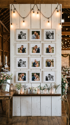 A gallery of framed couple photos on white barn wood creates a heartfelt guest focal point.