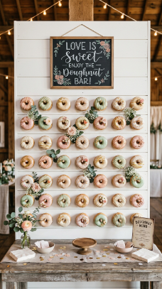 A white shiplap doughnut wall piled with glazed treats is charming, fun, and totally Pinterest-worthy.
