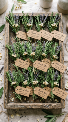 Bundles of fresh herbs tied with twine and a sprig of flowers make the sweetest guest favors.