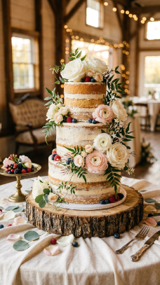 A simple naked cake displayed on a thick wood slice feels rustic, elegant, and deeply charming.