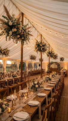 A glowing tent reception with florals suspended overhead feels like sleeping under the stars.