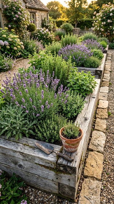 What makes it work: Weathered cedar naturally takes on a silver-grey tone that harmonizes beautifully with stone, soil, and foliage without competing. The rough limestone edging adds an irregular, hand-placed quality that feels genuinely old-world rather than kit-built. Together, the two textures create a layered ground-level composition that photographs brilliantly.