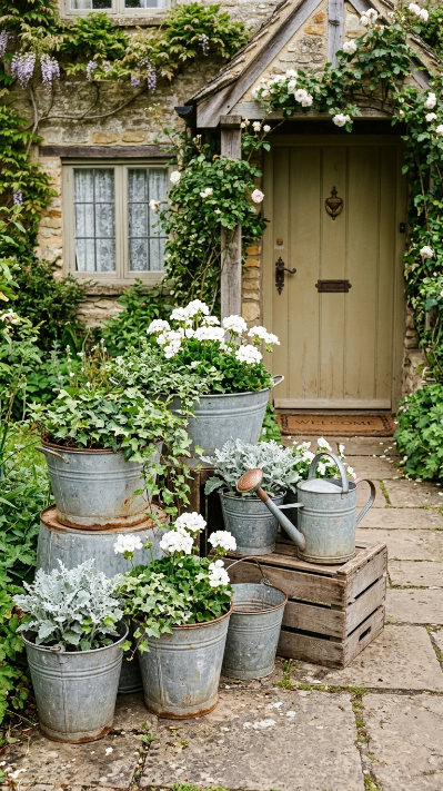 Vintage Galvanized Metal Planters Clustered at the Entry