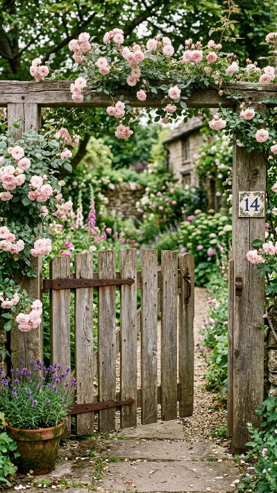 How to achieve it: Commission a local carpenter to build a simple vertical-plank gate from reclaimed pallet wood or salvaged fence boards. Plant a climbing rose (‘Cecile Brunner’ or ‘New Dawn’ are both reliably vigorous) at the base and train early with soft garden twine.