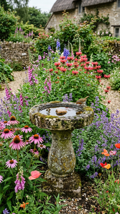 Stone Birdbath Surrounded by Wild Cottage Plantings