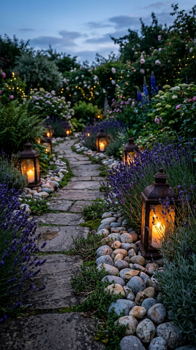 What makes it work: The combination of hard iron and smooth river stone creates a pleasing tactile contrast, while the low placement of lanterns keeps the lighting intimate rather than clinical. Solar-powered lanterns in a vintage iron style eliminate wiring entirely.