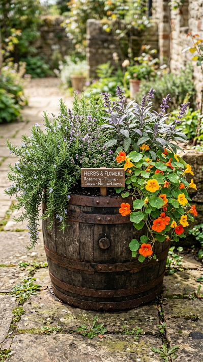 What makes it work: Oak barrel halves have extraordinary visual weight that anchors a patio space far better than standard plastic pots. The curved form softens hard paving beautifully. Mixing culinary herbs with edible flowers like nasturtiums gives the planting a wild, abundant quality while keeping it genuinely useful.