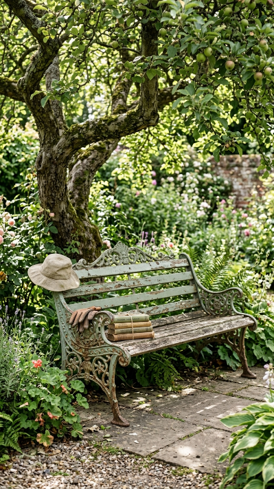 Antique Iron Garden Bench Beneath a Fruit Tree