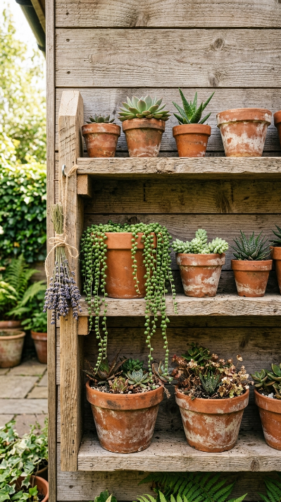 Terracotta Pot Collection on Reclaimed Wood Shelving