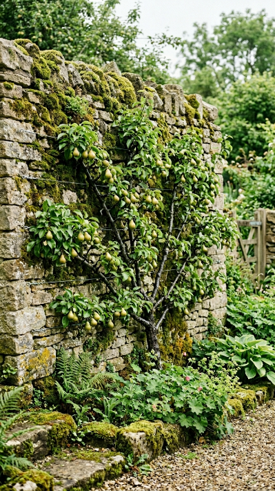 What makes it work: Espaliering a fruit tree against a stone wall is both supremely practical (the wall retains heat, advancing fruit ripening) and visually extraordinary — the geometric discipline of trained branches against the random texture of stacked stone creates electric contrast.