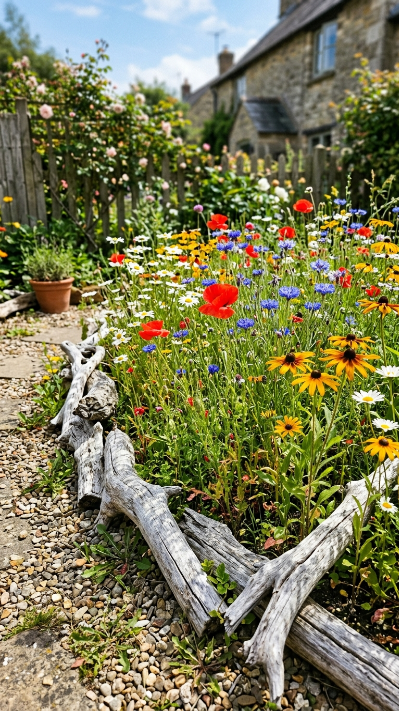 What makes it work: A driftwood border is the perfect rustic framing device — it defines the meadow patch without imposing any rigidity. The grey-silver of weathered wood makes every flower color sing against it, acting almost as a neutral ground for the color composition above.