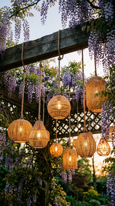 How to achieve it: Hang lanterns from a pergola using natural jute rope at three distinct lengths — roughly 30cm, 60cm, and 90cm drops — in groups of three. Use warm-white LED Edison bulbs at 2700K for the most flattering, flame-like quality.