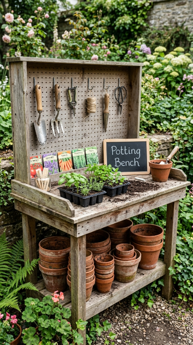 What makes it work: A potting bench transforms everyday gardening from a scramble into something pleasantly intentional. The pegboard back is the key feature — tools hung visibly are accessible immediately and contribute to the visual character of the bench rather than hiding in a drawer.