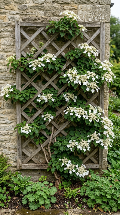 How to achieve it: Fix a weathered hardwood trellis panel at least 5cm from the wall to allow good air circulation. Plant climbing hydrangea in well-amended soil — it establishes slowly for two years, then grows with remarkable enthusiasm. No regular tying-in required once established.