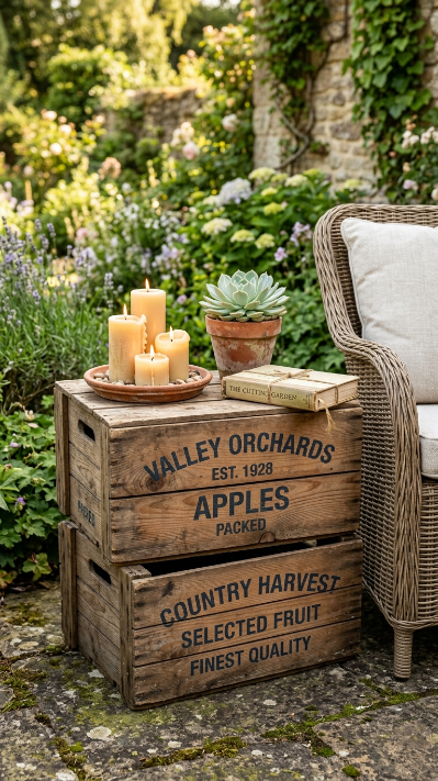 How to achieve it: Source vintage wooden fruit or wine crates at markets, antique fairs, or online. Seal lightly with exterior varnish thinned 30% with white spirit to protect without hiding the natural wood character. Stack with the bottom crate closed-side up for stability.