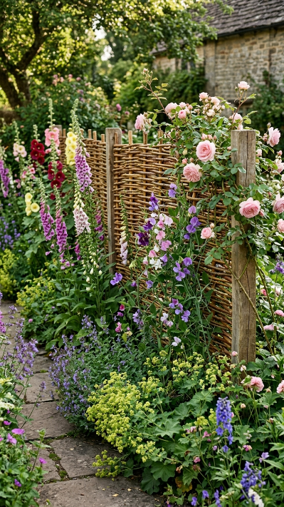 What makes it work: Willow hurdle panels have extraordinary rustic texture — the woven pattern catches light differently throughout the day, moving from warm gold to deep brown. Their semi-permeable structure lets air through, which cottage plants love, while still defining boundaries clearly.