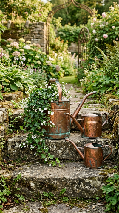 What makes it work: Copper is one of the most naturally beautiful metals in a garden context — it ages from bright penny to deep verdigris, and every stage of that journey is visually interesting. Grouped in three sizes on steps, copper watering cans create a vignette that reads as curated without feeling overthought.