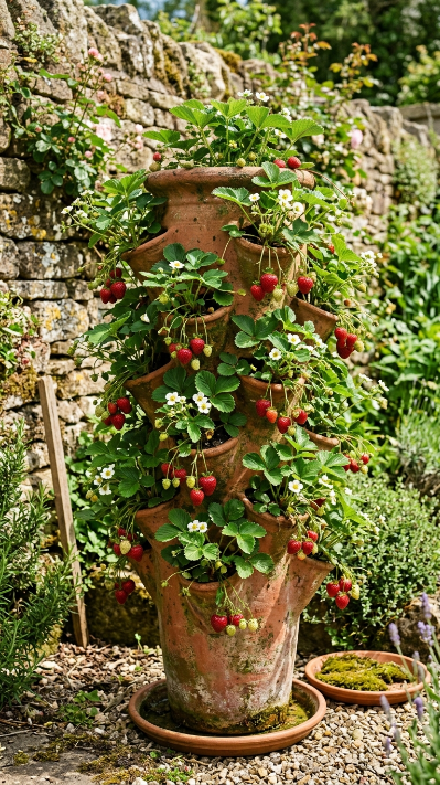 What makes it work: The layered architecture of a strawberry tower gives visual interest at every height simultaneously — trailing runners drape, flowers dot white across the surface, and red fruits appear in clusters throughout. An aged terracotta version brings all that productivity within a beautifully weathered, rustic shell.