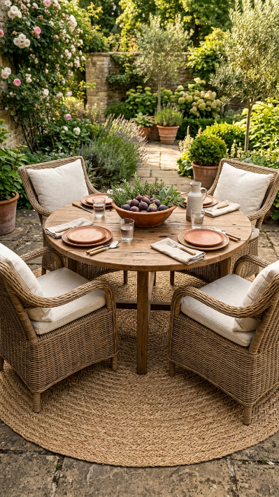 What makes it work: A rug beneath an outdoor dining set instantly defines the space as a room — it gives the arrangement permanence and intention. Seagrass is the ideal rustic outdoor textile: its natural colour and weave pattern harmonize with virtually every garden material, and it’s genuinely weather-resistant.