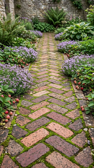 What makes it work: Reclaimed brick varies in color from batch to batch — deep reds, salmons, even near-purples — and that variation creates an organic, painterly surface underfoot that new uniform brick never achieves. Moss-filled joints soften the geometry and reinforce the ancient quality beautifully.