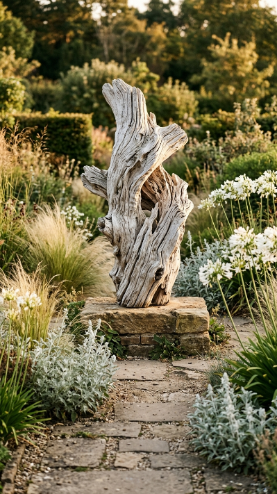 What makes it work: Large-scale natural sculpture gives a garden a gallery-like quality without any artifice. Driftwood is particularly powerful because its form is entirely unpredictable and unrepeatable — and that unique quality is visible immediately to anyone looking at it. Pairing with silver-toned foliage plants creates tonal harmony.