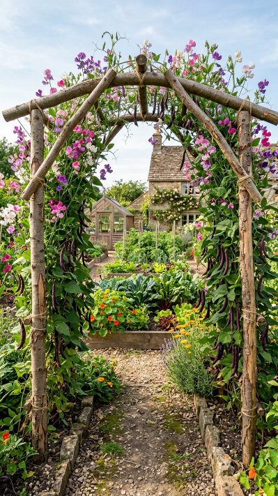 Rustic Garden Arch With Sweet Peas and Climbing Beans