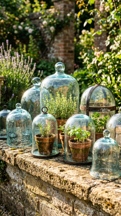 💡 Even a single antique glass cloche on a potting bench transforms the aesthetic of an entire garden corner instantly.